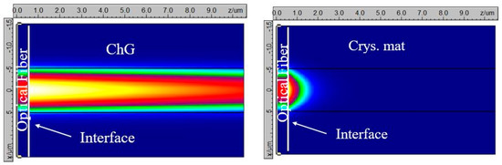Ge40Se60-capped fiber device: Power distribution at the fiber:ChG interface for (a) amorphous phase and (b) crystalline phase.