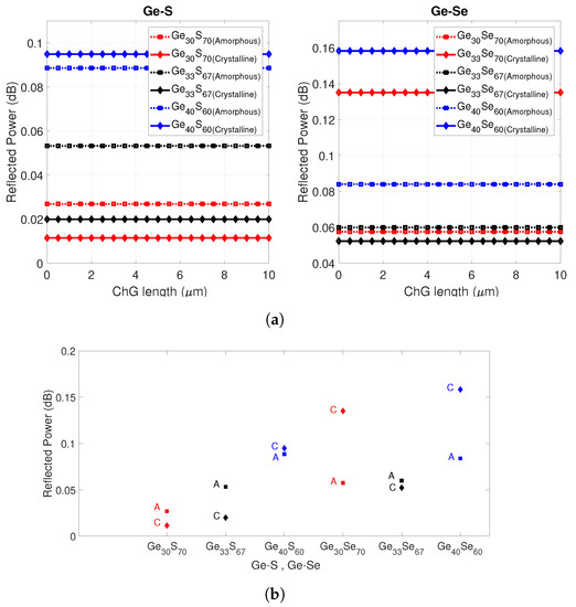 Next, the parametric effect of ChG material cap thickness on the reflected powers in the device was studied. Figure 3a shows the normalized reflected power back into the fiber for Ge-S (left)- and Ge-Se (right)-capped fiber devices, respectively, as a function of ChG cap thickness. The reflected power into the fiber shows different power level in the crystalline phase and amorphous phases due to the different extinction coefficient of the material as shown in Figure 3b. For most of the studied compositions, selecting an end cap thickness less than 10 m provides a relatively high extinction ratio that can be easily detected. From the simulation results, it is observed that all compositions except GeS, GeSe, and GeS show a considerable difference in extinction coefficient; examples are GeS, GeSe, and GeSe. All compositions (except GeS, GeSe) crystallize by a heterogeneous process by which several different crystalline phases appear and the structure becomes much denser, which leads to an increase in the refractive index [33]. The stoichiometric compositions, GeS and GeSe have similar total reflected power in both phases, which indicates that small changes occur in the material structure and band gap during the crystallization process, which is homogeneous in its nature [33].