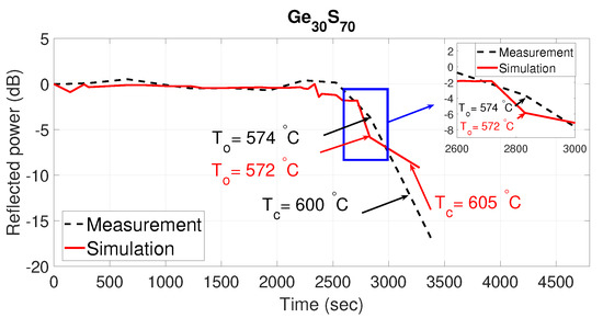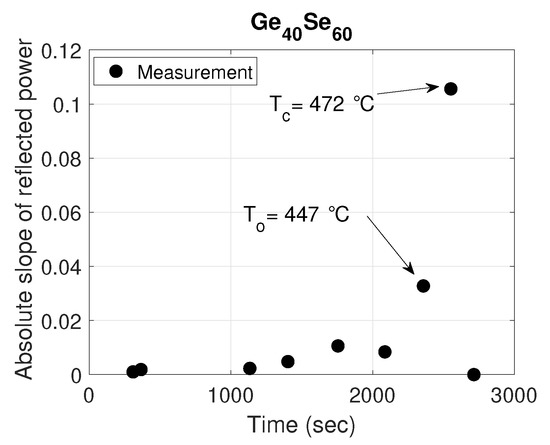The normalized measured reflected power (dotted black curve) as a function of time for two compositions: GeSe and GeS are shown in Figure 5 and Figure 6, respectively. The normalized simulated reflected power with extracted refractive index profile from studying the particular ChGs as a function of time is also plotted (solid red curve). It can be seen from the figures that the measured and the simulated results match very well. As the proposed sensor works on the principle of the phase change of ChG material, which is highly temperature dependent, abrupt changes in the reflected power are observed, as expected. These sudden changes and associated temperatures can be efficiently extracted from the sensor data by plotting the slope as a function of time. For example, from the data regarding the GeSe composition shown in Figure 5, a plot of the slope of measured reflected power as a function of time is shown in Figure 7. This figure manifests a big growth of the absolute slop of the reflected power between the T and T due to the large structural reorganization occurring in a solid state from the moment of the occurrence of the first crystallizes at the onset of crystallization T up to the full crystallization of the material at T. Two peaks stand out at 2462 s and 2627 s, corresponding to the onset and peak crystallization temperatures of 447 C and 472 C obtained from monitoring the temperature inside the furnace, which is close to the predicted temperatures of 446.6 C and 472.3 C.