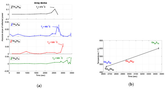 Arranging the single ChG tip-coated fibers in an array structure and monitoring the reflected power from each fiber will help with the real-time detection of several temperatures inside extreme environments, thus allowing mapping out the temperature profile. As mentioned before, each of the synthesized ChG compositions has a specific crystallization temperature which allows for accurate monitoring and recording of real-time temperature profile within a desired environment. As an example, the slope of the reflected power data from the array structure comprising of four optical fibers capped with four different ChGs (GeSe, GeS, GeS, and GeSe) within a temperature range of 472 C to 600 C is shown in Figure 8a. At lower temperature below T there are structural fluctuations in the solid state, due to the initial stages of crystalline organization of the material. For a better reading, the measurements presented at temperatures above T are demonstrated at higher resolution. The proposed array sensor is arranged from ChG dip coated devices which show lower error in temperature response. Correlating the peak slope and times provides a temperature evolution chart as shown in Figure 8b, while four distinct temperatures, 472 C, 485 C, 528 C, and 600 C are recorded with this array structure. Increasing the array size to accommodate several other compositions of ChGs will enable real-time and precise monitoring of temperature with higher temperature resolution. As the fiber diameter is 125 m, an array of 15–20 sensors, leading to a temperature resolution less than 10 C within 440–600 C will result in the sensor node area size smaller than 2.125 mm, which makes this array easily deployable within structures.