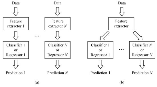 Different forms of multi-output prediction models. (a) Model consisting of a series of sub-models. (b) Model consisting of a public feature extractor and multiple predictors.