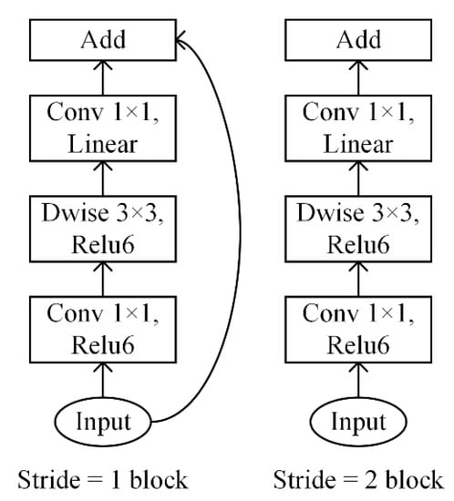 The proposed model is based on MobileNetV2 [], an efficient lightweight CNN architecture, which performs well on ImageNet classification, COCO object detection and VOC image segmentation. Compared with other modern networks, it decreases the number of operations and the memory needed while retaining high accuracy and is especially suitable for resource constrained environments like industrial environments. The basic building block of MobileNetV2 is a bottleneck depth-separable convolution with residuals, whose structure is shown in Figure 2, and it has the following characteristics. First, it replaces the standard convolution operation with the depthwise separable convolution which consists of two separate layers. The first layer is called a depthwise convolution that performs lightweight filtering by applying a single convolutional filter per input channel, and the second layer is called a pointwise convolution that performs 1 × 1 standard convolution. The computational cost of the depthwise separable convolution is much smaller than that of the standard convolutions at only a small reduction in accuracy. Second, the linear bottleneck layer is inserted into the end of the building block to prevent non-linearities from destroying too much information. Third, an inverted residual structure is introduced. The shortcut connection is inserted between the building blocks, as shown for the block with stride = 1 in Figure 2. This design can improve the ability of a gradient to propagate across multiplier layers. In addition, in the building block the input is expanded to high dimension at the start and projected back to low dimension at the end, in order to make it possible for the network to represent more complex functions. The architecture of MobileNetV2 contains the initial fully convolution layer with 32 filters, followed by 19 residual bottleneck layers. What is more, the original MobileNetV2 is aimed at color images with 3 channels, but in this research the input image is grayscale images with a single channel, so the input channel of MobileNetV2 is changed from 3 to 1.