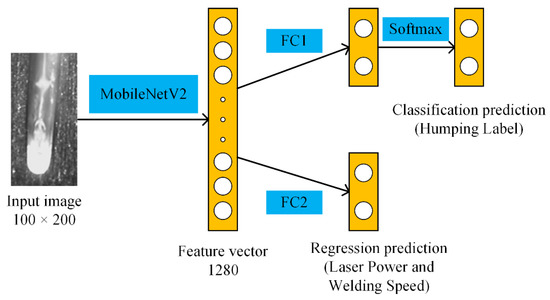 For an input image, MobileNetV2 outputs a feature vector with a length of 1280. In order to achieve the multi-output prediction, we propose the MobileNetV2-C&R network model, where 2 fully connected (FC) layers are added in parallel at the end of MobileNetV2. One FC layer followed by a softmax function is used for the classification prediction, outputting the humping label (humping or no humping). The other is used for the regression prediction, outputting values of laser power and welding speed. The output of the model can be expressed as [humping label, laser power, welding speed]. The architecture of the model is shown in Figure 3. In the training process of the network, a loss function is required. Generally, a common loss function for classification problems is the cross-entropy loss, and for regression problems is the mean square error loss. In MobileNetV2-C&R, both classification and regression are performed, so we build a function as the total loss function:
