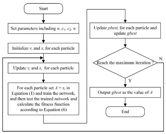 PSO is applied to search for the optimal value of which leads to the largest value of . The flowchart of the optimization process is shown in Figure 4. Then the optimal value of is substitute into Equation (1) and the loss function of MobileNetV2-C&R-PSO is got.