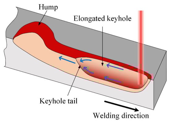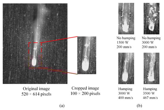 In Grad-CAMs of humping label, for all six samples, the highlighted region is mainly concentrated on the melt pool region in the upper part of the image. In fact, the appearance of this region will exactly change once humping occurs. The appearance of the melt pool when humping occurs is shown in Figure 13, which is usually accompanied with high laser power and high welding speed. At this time, the melt stream with high rearward velocity exists in the melt pool, and the instability of the melt stream is the main cause of humping [,]. Meanwhile, the keyhole in the melt pool will be elongated, and the liquid level rises at the keyhole tail, which forms a bright region in the image. The highlighted region in the Grad-CAM of humping label is exactly the bright region at the tail of elongated keyhole when humping occurs, which means that the model predicts the occurrence of humping mainly according to the existence this region.