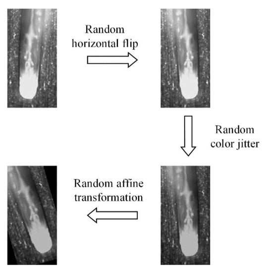 Next, data augmentation is performed for images in the training set, which can enhance the diversity of the data, help to overcome the overfitting in the training and improve the robustness of the trained model []. Three transformations are performed in sequence, including random horizontal flip with a probability, random color jitter (random changing of the brightness, contrast and saturation) and random affine transformation. The process is shown in Figure 7.