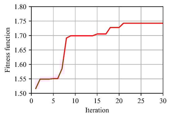 Based on the preprocessed training set, PSO is introduced to optimize the loss function of the network, as described in Section 2.2. Parameters of PSO, including , , , and , are set to 5, 0.5, 0.5, 0.8, respectively, and 30 iterations are performed. The change of the fitness function in the optimization process is shown in Figure 8. The value of the fitness function rises to 1.7486 and the corresponding optimal value of is −0.9347. Then with the optimized loss function, the network is trained for 30 epochs. In the training process, the batch size is 20 and Adam algorithm [] is implemented. What is more, dropout [] is used before FC layers to alleviate the overfitting. Finally, we get the trained MobileNetV2-C&R-PSO model.