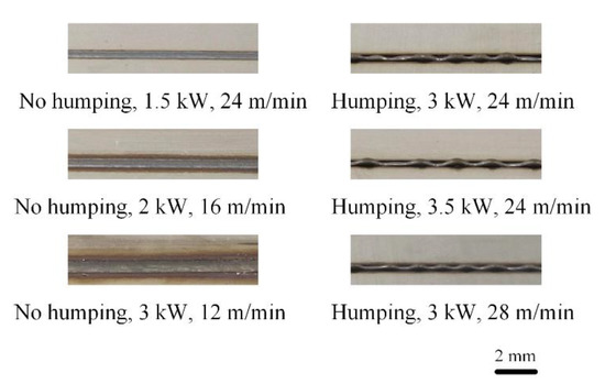 Through visual tests, we find that humping appears in six experiments and no humping occurs in the other nine experiments. Appearances of some welds in experiments are given in Figure 9.