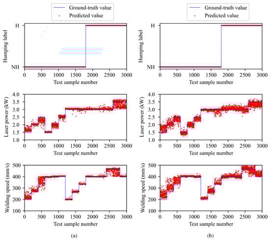 The production efficiency of laser welding can be improved with the improvement of welding speed. Although many defects can occur in laser welding, like spatter and misalignment, humping is one of the most typical defects in high-speed laser welding [,]. In addition, because of performance problems of the equipment or the misoperation by workers, the actual welding parameters including laser power, welding speed and defocusing amount may deviate from the required values. For example, the aging of the laser can make the output laser power smaller than the setting power, and a speed sensorless motion device cannot ensure steady welding speed [,]. These problems are difficult to find in high-speed laser welding with naked eye as the welding process can be very quick. Under such circumstances, even no obvious defect appears, the performance of the weld can also be substandard. Therefore, in order to achieve comprehensive monitoring of the high-speed laser welding, it is necessary to simultaneously monitor the occurrence of defects and welding parameters. In this research we focus on the occurrence of humping, as well as the values of laser power and welding speed. Generally, the occurrence of humping is related to laser power and welding speed. However, if we predict the laser power and welding speed first and then predict the occurrence of humping according to the predicted values of the laser power and welding speed, the result will be influenced by prediction errors of laser power and welding speed. If all outputs are predicted directly from the input data, the output could be more accurate. Therefore, a multi-output model able to perform classification and regression simultaneously is required. However, in the existing research of welding state monitoring, researchers mainly built CNN-based single-output models to analyze collected image data. To build a multi-output model, one way is to build a series of single-output sub-models to predict each of these properties, respectively, as shown in Figure 1a. However, if the multi-output model is designed in this way, each sub-model needs to extract features from the original data by itself and cannot share features with other sub-models, so the building and using of the model can be tedious and inefficient. In order to simplify the model and improve efficiency, another way is to build a public feature extractor to extract features from the original data, and then input features to several predictors to make prediction of multiple properties, as shown in Figure 1b.