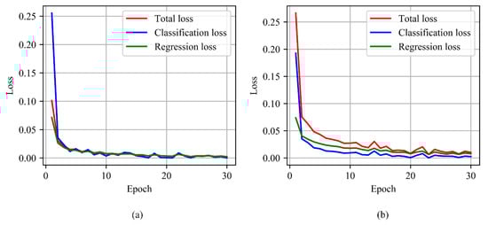 First, we compare the performance of MobileNetV2-C&R-PSO and MobileNetV2-C&R. In order to make comparison more intuitively, prediction results of them on the test set are also given in Figure 10. From Table 1 and Figure 10 we can notice that these two models both achieve 100% accuracy on the classification problem. However, MobileNetV2-C&R-PSO performs better on the regression problem, achieving better and MAE. In order to explain this difference, loss curves in training processes of these two models are given in Figure 11, from which we can find that classification losses of these two models both converge quickly, but the regression loss of MobileNetV2-C&R-PSO converges obviously faster than that of MobileNetV2-C&R and can converge to a smaller value in the end. In the training process of MobileNetV2-C&R, the classification loss converges faster than the regression loss. In the total loss of MobileNetV2-C&R-PSO, the classification loss has a smaller weight, so in the training process, the network can pay more attention to the regression problem. Therefore, the model can achieve better performance on the regression problem while retaining good classification accuracy.
