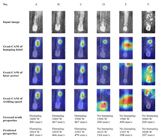 In the Grad-CAMs of laser power and welding speed, for samples A, B, and C, of which the laser power and welding speed are both high, the highlighted region is similar to that in the Grad-CAMs of humping label. This means that the model predicts these samples having large laser power and welding speed also according to the bright region at the tail of elongated keyhole. For sample E with low laser power and high welding speed, the highlighted region in its Grad-CAM of laser power is mainly concentrated on the top of the image. In fact, this sample has the lowest energy density among these samples, so the melt pool is short, and the solidified weld appears on the image top. The diffuse reflection of the light from the auxiliary light source happens here, so this region has high brightness in the image. The model predicts the low laser power of this sample according to the solidified weld. For sample F with high laser power and low welding speed, the highlighted region in its Grad-CAM of laser power is concentrated on the front and middle of the melt pool, which is very different from other samples. In fact, this sample has the highest energy density among these samples, and a penetration hole appears in the keyhole. The model notices the penetration hole and takes it into consideration when predicting the laser power.