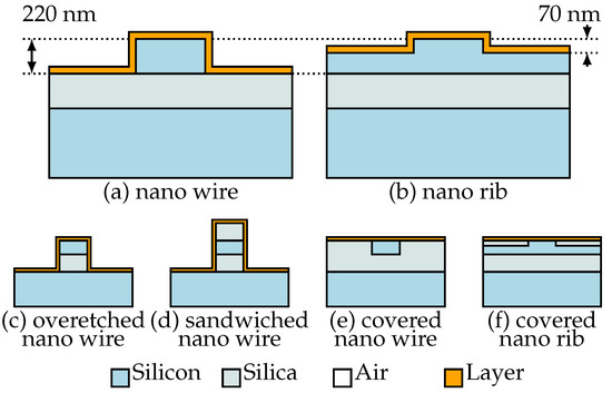 The proposed waveguide structures (d)–(f) solve the problem between horizontal and vertical surfaces at the cost of a reduced sensor sensitivity. Here the covered nanowire and the covered nanorib only consider the field at the top surface of the waveguide for sensing (Figure 2e,f). This surface can be produced at very high quality using chemical-mechanical polishing (CMP). The sandwiched nanowire (Figure 2d) uses the field at the waveguide sidewalls and might suffer from the side wall roughness caused by lithography and etch steps during the sensor production.