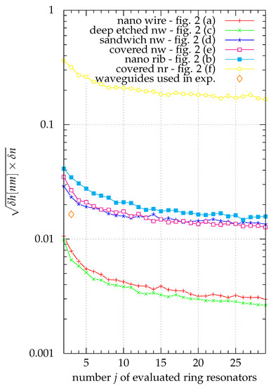 For each of the waveguide geometries, this was done for sets of two to 29 different waveguide widths chosen from the range of simulated waveguide widths of . Uncorrelated measurement errors for the wavelength measurements , each as an independant random variable drawn from the same distribution, were assumed. In case of less than possible selections of waveguide widths for a given number j of waveguides to be selected, all possible selections were examined. In cases with more possible combinations, random ones were sampled. For each number of different waveguide widths j, the combination of waveguides that lead to the smallest measurement uncertainties was considered.