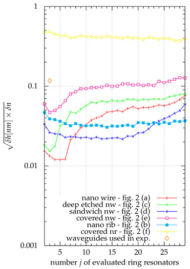 with the effective index , the group effective index , the layer refractive index , height , the wavelength , layer refractive index sensitivity and layer height sensitivity . is the index for the ring resonators that compose the sensor; j is the number of ring resonators with different waveguide widths used in the sensor. For the simulations, different waveguide widths were used. In the experiment there were rings with different waveguide geometries.