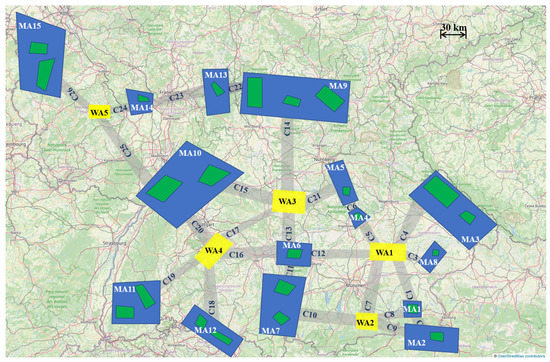 The operation is assumed to take place in an organized airspace consisting of different types of dynamically allocated operation areas, in order to reduce congestion in the lower stratosphere. In particular, and as shown in Figure 1, the HAPSs will be able to operate in Mission Areas (MAs, represented in blue), Corridors (Cs, in gray), and Waiting Areas (WAs, in yellow).