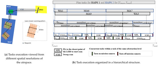 Figure 2 illustrates the representation of a hierarchical task plan considered in this work. In particular, on the left side, Figure 2a shows, over a portion of the mission scenario, the execution of the task plan for a HAPS that, after the first task in WA1, continues monitoring first the unique LOI in MA6 and afterwards the two LOIs in MA7. This figure also shows the waypoints followed by the HAPS to move within MA1 and MA7. On the right side, Figure 2b shows the hierarchical structure of the task plan of the HAPS represented in Figure 2a and of a second HAPS (not depicted in Figure 2a). That is, it shows how the plans that govern the two HAPS to monitor the LOIs within the horizon [ T start , T end ] are initially decomposed into the tasks expressed at the MA-level (represented at the two top timelines, one for each HAPS), followed by the tasks expressed at the LOI-level (represented at the two intermediate timelines) and finally by the actions presented at the WP-level (shown at the two bottom-most timelines). At the lowest level, vertical color bars without text annotation represent instantaneous tasks, for example, to turn on or off the mission camera.