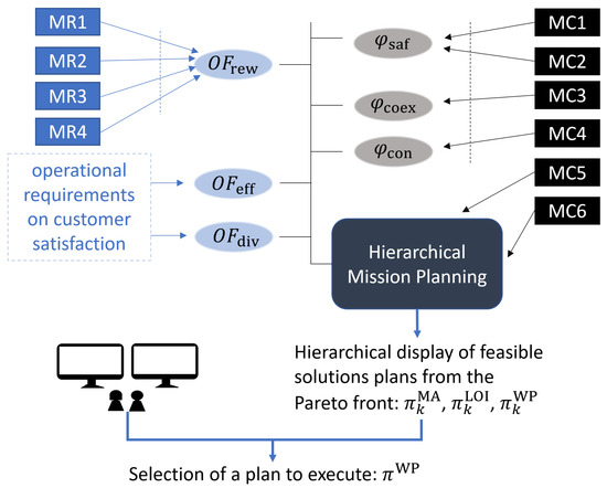 To help the reader understand the relationship of the elements presented in this section and the previous sections, Figure 3 shows how the MRs and MCs described in Section 2.4 and Section 2.5 are mapped into the three Objective Functions ( O F rew , O F eff , O F div ) and the three constraint criteria ( φ saf , φ coex , φ con ) that are formally stated in this section. Furthermore, Figure 3 also illustrates the role of the operators as human decision makers, i.e., how they select a plan ( π k MA , π k LOI , π k WP ) among the feasible solution plans that form part of the first Pareto front determined by the planner that will be presented in Section 4.