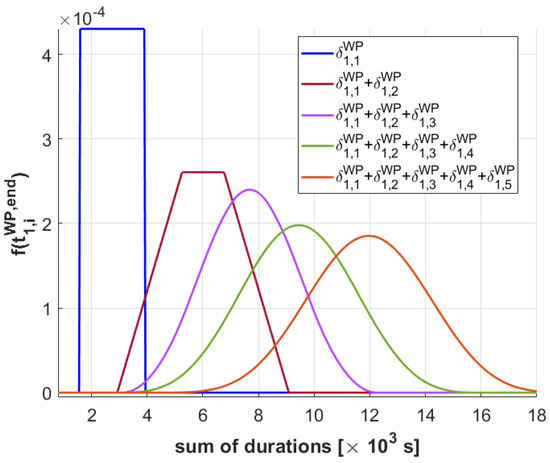 Assuming that lingering between the tasks at any level is forbidden, task o h , i WP terminates at t h , i WP , end = t 0 + Σ j = 1 i δ h , j WP , where t 0 is the deterministic start time of the plan, while Σ j = 1 i δ h , j WP follows the distribution of the sum of i nonidentically distributed uniform random variables δ h , j WP . Therefore, the probability density function f ( t h , i WP , end ) of completing the i t h WP-level task of HAPS h at a given time can be calculated with the following expression, as derived in [16]: