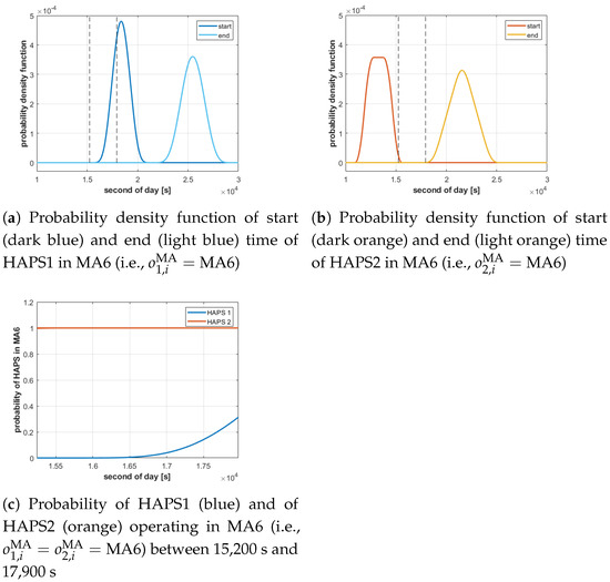 Figure 5. Probabilistic evaluation of the start and end time of the operation of HAPS in a MA and probability of their operation in the MA within the duration marked by the vertical dash lines.
