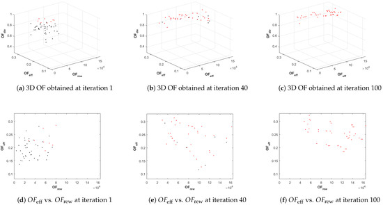 Figure 7. Values of the objective functions of the best Pareto front (marked in red) vs. values of the OFs of the remaining population (marked in black) for SC1 and PC1. The top row of graphics represent in 3D the values of the three OFs, while the second row only shows the values of two of them