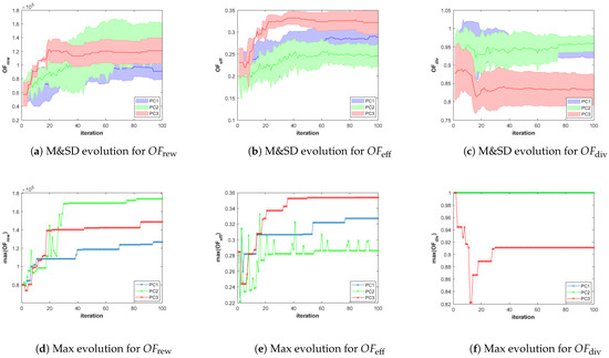 Figure 8. Evolution graphics of the OFs of the feasible solutions of the best Pareto front for SC1. The top row of graphics shows the evolution of the mean and standard deviation (M&SD) of each OF, while the bottom row shows the evolution of the best (Max) value of each OF.