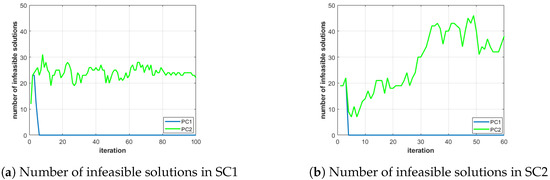 Figure 9. Infeasible plans in the population for PC1 (blue) and PC2 (green) for SC1 (a) and SC2 (b).