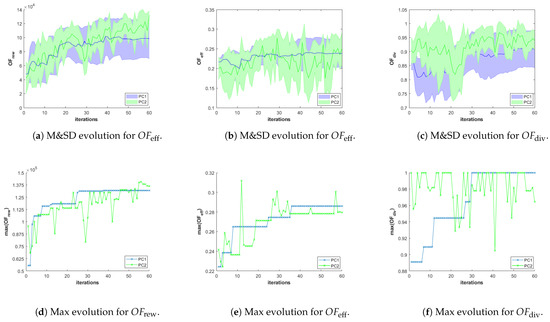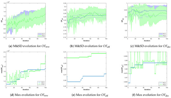 Figure 11. Evolution graphics of the OFs of the feasible solutions of the best Pareto front for SC2. The top row of graphics shows the evolution of the mean and standard deviation (M&SD) of each OF, while the bottom row shows the evolution of the best (Max) value of each OF.
