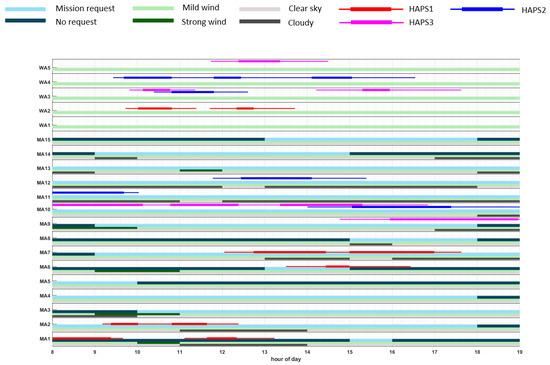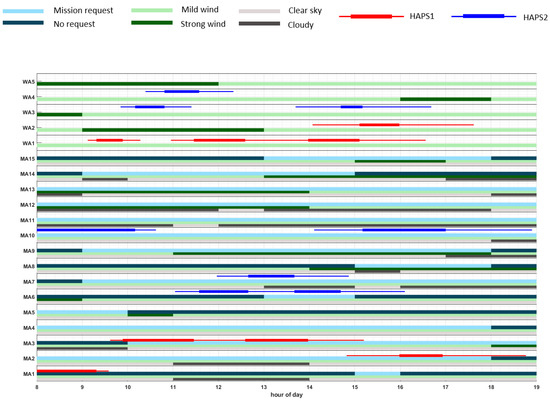 • MA level, where the plans are the sequences of mission areas (MA#) and waiting areas (WA#) that each HAPS operates.