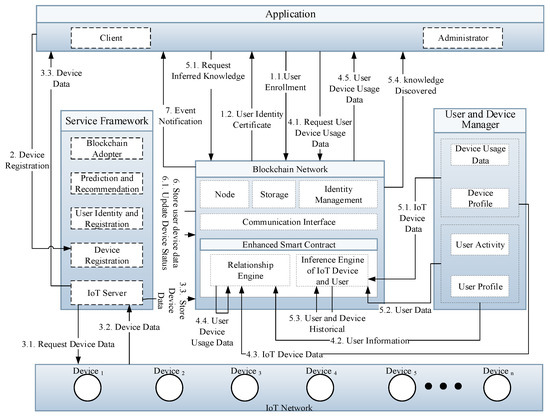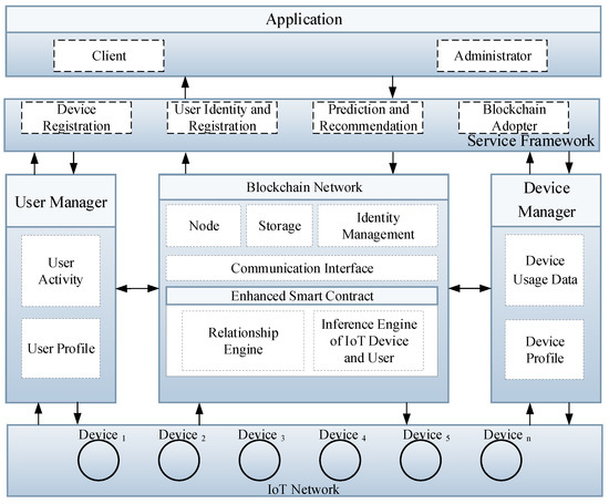 The Internet of Things (IoT) comprises of devices that generate, process, and exchange huge amount of critical data as well as privacy-sensitive information. To assure user privacy, a light-weight, transparent, high-throughput, and scalable blockchain IoT platform has been introduced to safeguard users’ privacy. Figure 1 presents the intelligent service model that is based on enhanced smart contract with a relationship and inference engine in an IoT network that consists of four modules, such as application, service framework, blockchain network, and IoT network. The application module comprises of a client and administrator whose responsibility is to interact with the front-end using the Representational State Transfer Application Programming Interface (RESTful API). Similarly, the service framework is responsible for services that are related to device registration, user identity, user registration, recommendation, and blockchain adopter, etc. These services are offered by intelligent IoT blockchain architecture, which performs user and device management. The user and device manager are used to acquire data from the IoT and user network. The data that are gathered from the user manager include user activity and user profile, whereas the device manager manages data related to the device profile and device usage data. The intelligent blockchain smart contract consists of relationship and inference engine, which is used to calculate and infer new knowledge from the user and device manager. The data from the user and IoT network are stored into the blockchain and visualized to the client application using the blockchain adopter. Finally, the blockchain network is a distributed ledger technology consisting of several peers that are used to track, authenticate, and execute the set of transactions in a Peer-to-Peer network. The distributed ledger is a shared replica of data that are available across the blockchain network where all of the participants of the network can have the same copy of the ledger.