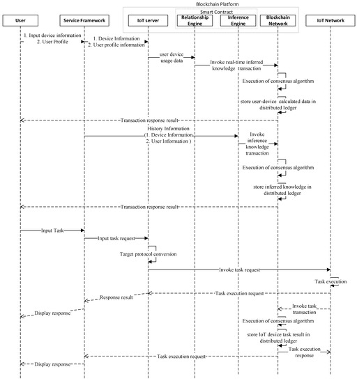 Sequence diagram of intelligent service based on enhanced smart contract enabled relationship and inference engine in IoT network.