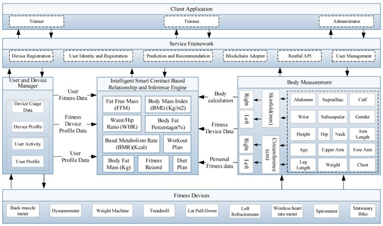 The output of the proposed fitness blockchain platform is derived from the fitness devices, user profile, and user-device usage data using smart contract-based real-time inference engine. The user device data calculation is monitored, analyzed, planed, and then executed while using the mathematical model that is defined in the smart contract.