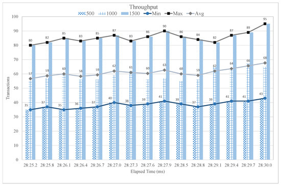 Figure 12 contemplates the transaction per second (TPS) results, also known as throughput of the proposed blockchain-based intelligent fitness service. The experiments are carried using Hyperledger Caliper, where we have considered different user groups to evaluate the performance of proposed intelligent blockchain-based fitness service. The defined user group is divided into three different sub-groups i.e., 500, 1000, and 1500 users. We also calculated some statistical measure, such as minimum, maximum, and average throughput in order to evaluate the performance of the proposed case study using IoT blockchain platform. Initially, we considered 500 users to evaluate the throughput of the developed blockchain platform. It is observed that the throughput in the case of 500 users group remains stable with a minimum of 35 TPS and maximum of 43 TPS. Similarly, in the case of 1000 users group, the number of transactions are balanced at every elapsed time with a minimum of 57 TPS and a maximum of 68 TPS. Finally, for the 1500 users group, the throughput is also steady with a minimum of 80 TPS and a maximum of 95 TPS. It is observed that the throughput increases as the number of users in the network increases. Moreover, increasing the number of users will not affect the throughput or degrade the system performance in terms of transactions per second.