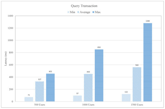 In Figure 14, the query function of the proposed intelligent blockchain-based fitness case study is evaluated in terms of latency. We have considered three different users groups to access the performance of the designed blockchain platform. The user-group is 500 users, 1000 users, and 1500 users. The query transaction latency is the time of getting a response from the blockchain network. The query transaction latency for 500 users group in term of minimum, average, and maximum latency is 71 ms, 327 ms, and 445 ms, respectively. Similarly, in the case of 1000 and 1500 user groups, the minimum, average, and maximum latency are 97 ms, 450 ms 850 ms and 122 ms, 560 ms, and 1280 ms, respectively. It is observed from the graph that the average query transaction latency is increased with the increase in the number of user of the blockchain network.