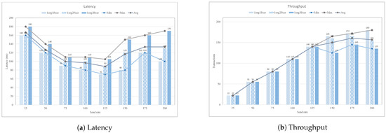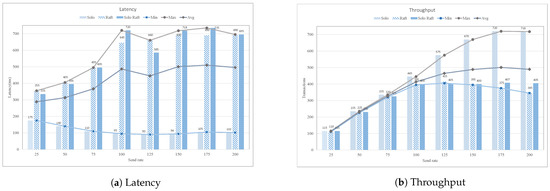 Figure 15a shows the minimum, maximum, and average latency with different transaction send rate. Similarly, Figure 15b presents the throughput of solo, raft, and solo-raft in terms of minimum, maximum, and average throughput. It is found from the graph that the solo order achieves the higher throughput among other ordering services, because it has single node that does not require an additional TLS mechanism.