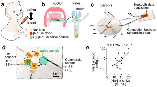 Flexible electrochemical sensor system for non-invasive detection of salivary sodium ions. (a) Schematic illustration of an infant subject to extract both saliva and blood samples to validate the sodium sensor performance. Direct, invasive blood sampling is less favored due to discomfort, bruising, and infection. (b) Illustration of a non-invasive saliva sample collection process. (c) Photo of an integrated system, including thin-film electrochemical sensors and a low-power wireless circuit for data acquisition. (d) Zoomed-in view of a salivary sample loading area with both film sensors and a commercial sensor, composed of a pair of an ion-selective electrode (ISE) and reference electrode (RE), for the performance validation. The required sample volume for the thin-film sensor system is less than 400 μL, which is much smaller than the requirement (over 1 mL) of a commercial device. (e) Positive correlation results of sodium ion levels between blood samples and saliva samples with the flexible sensor for sodium detection (n = 14).