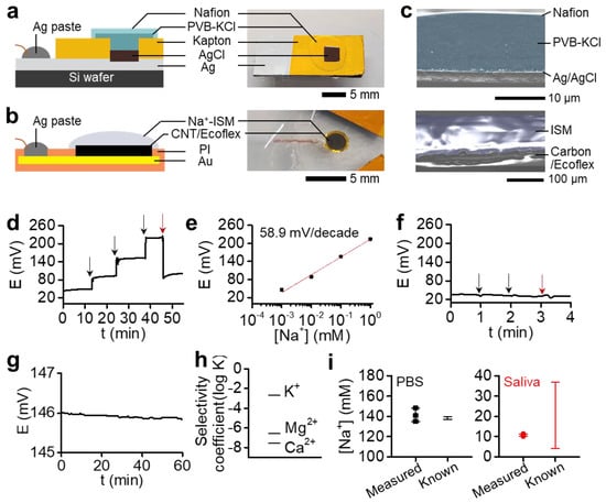 Figure 2d,e present a voltage transient and linearity from the fabricated ISE. The real-time voltage data were measured for 10 min in different sodium chloride solutions (10−3 to 1 mM) and the saliva. The sensitivity obtained through calibration is 58.9 mV/decade near a theoretical (Nernstian) sensitivity (n = 3) (Figure S3a). While the repeatability was confirmed in the range covering the salivary sodium ion levels, the detection range and limit were determined to be 5 × 10−5 ~ 1 M and 4.27 × 10−5 M, respectively (Figure S3b). The sensor characteristics contribute to the voltage stability of the RE. As shown in Figure 2f, RE showed stable voltage values in the sodium chloride solutions of 10−3, 10−2, and saliva. The changes in voltage are negligible compared to those observed in the ISEs. As a result, the ion sensor composed of a pair of SS-ISE and RE showed good voltage stability and ion selectivity. Figure 2g captures the sensor’s stable voltage measured in a 0.1 M sodium chloride solution for an hour, showing the minimal voltage change by 0.2 mV/h. Selectivity analysis, carried out with the most abundant interference ions in body fluids, resulted in good coefficient (log K) values of −2.68, −7.52, and −6.57 for K+, Mg2+, and Ca2+, respectively (Figure 2h). The selectivity coefficient is calculated by a separate solution method by using the potential at 0.1 M [31,32], while detailed calculation methods are provided in our previous works [18,33]. Collectively, the sensing capability and signal stability are achieved by constructing multiple layers of the electrode structure, improving interlayers’ adhesion and encapsulating all contact areas that can cause signal noises. Using the sensor system, we could successfully measure the sodium ion levels in PBS and saliva samples (Figure 2i). The resulting levels from three tests show calculated values of 141 ± 7 mM and 11 ± 1 mM in PBS and saliva, respectively. The sodium levels of PBS show only <4 mM difference to known values, confirming the acceptable upper limit for the difference between the two methods [34]. The measured saliva levels of 11 mM are in the reported range of the sodium levels in saliva [22]. Future work regarding sensor fabrication will adopt a printing of the flexible ion-to-electron transducer for large-scale production and great reproducibility.