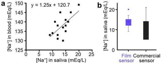 (a) Correlation of sodium ion levels measured from blood and saliva. (b) Correlation of sodium in levels measured from our sensor and commercial sensor.