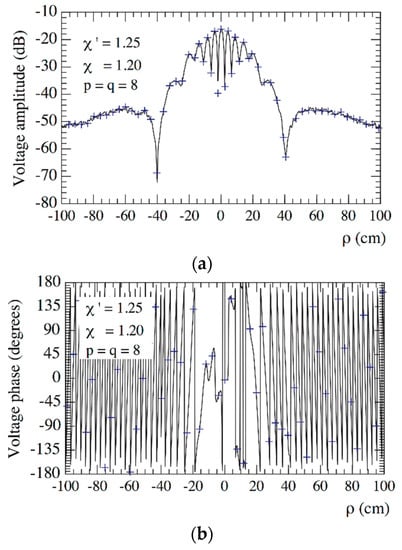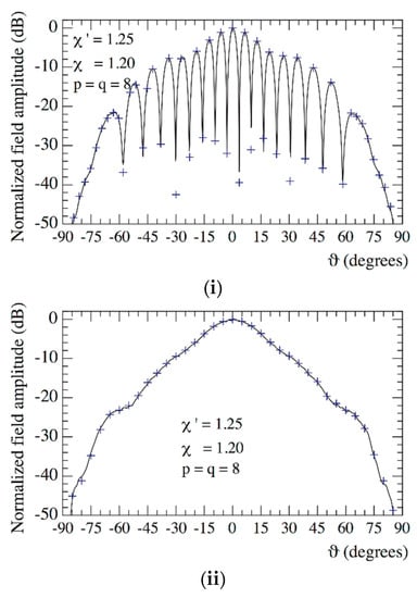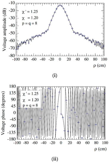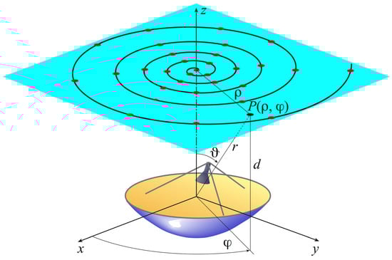 collected along the spiral. The considered plane-rectangular sampling grid lies on a square with side 50 λ, inscribed in the measurement circle and spaced by 0.4 λ. Then, the adopted probe enables the use of Equation (19) to get, in a “soft” way, the co-rotated