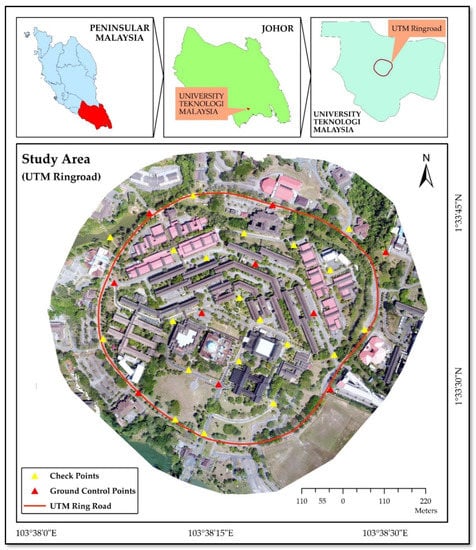 The study site lies in the center of University Technology Malaysia (UTM), having an area of 0.51 km2 and shown by the red line in Figure 1. This is the main campus area of this university. This part of the university campus is built on a small hill surrounded by a ring road. That is why all the connecting roads from the campus to the ring road have a gentle slope. UTM is located in the Johor State, the most southern part of Peninsular Malaysia. This area has different manmade structures like grounds, buildings, footpaths, cafeterias and parking. Additionally, some vegetation can be found in this area. This area is a paradise for the large scale mapping experimental work because of the multiple topographic variables with a blend of modern developments.
