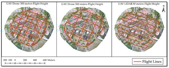 UAV images and UAV LIDAR data were acquired for this research. UAV images are characterized by small ground coverage, huge image count, more flight lines and more data collection time [29]. Moreover, more close to the ground, the flight is more vulnerable to shadow and illumination. Therefore, this study aims at using certain image processing techniques to make high flying height UAV images usable in comparison to low flying height UAV images. For this purpose, two different flying height surveys were planned, one with 300 m flying height and the second with 500 m flying height. Figure 2 shows grid pattern flight lines of UAV used for the survey and Table 1 provides details of flight plans and their outcomes. The 300 m and 500 m flying height plans were executed in Drone Deploy software, but for the capturing of both, format .JPG and .RAW images with assistance from DJI Go 4 software were used as well. RAW data was captured because .JPG is a compressed format that may not allow further enhancement, whereas .dng is a RAW format and provides original RGB data (.dng i.e., known as digital negative).