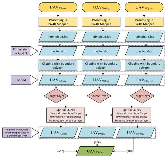 The first product after data processing is a dense 3D point cloud based upon image matching and georeferencing of images in SFM workflow. A 3D point cloud consists of millions of points having Northing, Easting and Height values for each point. This 3D point cloud is used for further mesh building, orthophotos and DSM/DTM generation. Properties of a 3D point cloud are mainly analyzed in terms of its accuracy, completeness and distribution. Table 3 provides a comparison of the resultant changes in point clouds of multiple datasets. The objective of this study is to assess the accuracy enhancement of topographic products of high flying height UAV images comparable with low flying height UAV images. Therefore, all three dense point cloud products (UAV500.jpg, UAV500pan and UAV500grey) were merged to increase the density of the point cloud. At the first step, UAV500.jpg and UAVpan filtered and merged on the condition that each point must lie at greater than 5 cm distance from each point of UAV500.jpg. For this, a spatial location query, namely “are within a distance of source layer feature” was used, the source layer in this query was UAV500.jpg and UAV500pan was the target layer. A similar iteration was applied to UAV500.jpg and UAVgrey. In the result, a point cloud file was generated having all points from UAV500.jpg + selected points from UAV500pan + selected points from UAV500grey. This final point cloud file has 10,152,253 usable point cloud with 19.66 m2 density, instead of 12,212,883 point cloud with 23.66 m2 density. The single dataset in terms of dense point cloud produced will now be termed as UAV500Enh. Figure 4 provides the processes followed for point cloud merging and filtration.