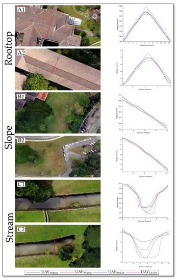 The lack of standard reporting protocol for SFM accuracy assessments and unique challenges associated with modelling different landscapes necessitates an independent evaluation of UAV survey designs for different landscapes [56]. A statistical accuracy assessment of image radiometric enhancement effects was made through cross sectional analysis of multiple DSMs, the locations of the cross sections are shown in Figure 5. In total, 16 cross sections have been evaluated in the data, and out of them the result of six cross sections are shown in Figure 6, which clearly highlights the effect of the proposed model on topographic variants. Amongst the six cross sections given in Figure 6, cross section A1 and A2 represents building rooftop, cross section B1 and B2 represents gentle slope on a grassy surface and cross section C1 and C2 represents stream. The choice of more than one cross section in similar surfaces is strongly advocating for the significance of the proposed image enhancement methodology.