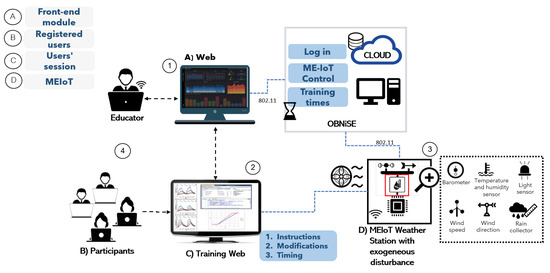 The OBNiSE IoT architecture for Educational Mechatronics involves several elements that interact at different levels of the system. For example, a Web system that includes data visualization from the MEIoT weather station’s sensors, a training web that is part of the web, a MEIoT weather station with different data sensors, and users that are divided into two categories educators and participants. Each of them is described in detail below.