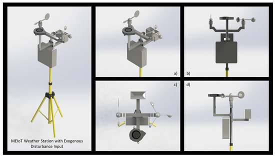 MEIoT weather station with exogenous disturbance input. (a) Isometric view, (b) front view, (c) top view and (d) right view.