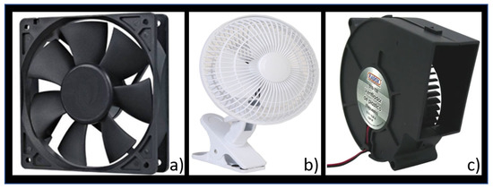 Figure 4. Wind sources as the exogenous disturbance input. (a) Computer fan, (b) mini desktop fan, (c) air blower. - Network Layer: This layer considers tools, user profiles, and data accessibility and ensures communication between the architecture’s devices and layers. The H-Bridge for actuating the blower is connected through a microprocessor dedicated Pulse Width Modulator (PWM) pin port with two digital signals for direction and enabling. The network layer is integrated by three elements: tools, user profiles, and data accessibility. Each item is composed as follows: