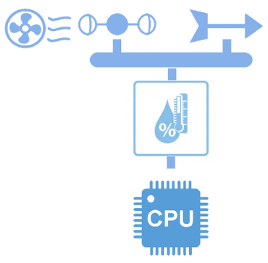 The MEIoT weather station comprises a microchip microcontroller containing a Control Processing Unit (CPU) to process the information. The microcontroller is connected to the sensors to receive the sensed data and a motor-based actuator that can be activated and controlled (speed and spin direction) through PWM. The microcontroller is also connected to the cloud to upload the sensed data via WiFi. Figure 6 depicts the icon used for MEIoT weather station, adding the exogenous disturbance input.