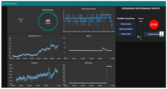 Figure 9 shows a dashboard screenshot from an 15 min experiment we made to test the sensors’ response. In the upper row, from left to right, we can see the wind direction and wind speed; in the middle row temperature and relative humidity; and the bottom row shows barometric pressure and pluvial precipitation. Finally the exogenous disturbance input control is shown in the screenshot’s upper right, where it can be controlled automatically via the profile functions or manually through the sliding bar. Light sensor measurement is not shown as it was not tested in our experiment.