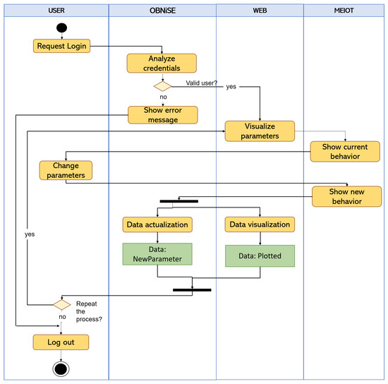 - Web system. It is hosted in a cloud system, which can be accessed by educators. The web shows all the sensors’ parameters and data that can be manipulated, the graphs of the real-time sensed data, the configuration of the MEIoT weather station, and the users’ training times per session. This web system is stored in the OBNiSE.