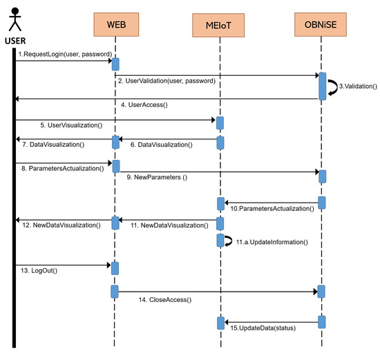 The MEIoT weather station records the modifications made in user sessions directly from the Web system connected to the cloud and allows users to graph the data. As already mentioned at the beginning of this section, the architecture presented respects the OBNiSE architecture interactions.
