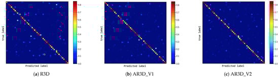 It can be seen from Table 4 that the accuracy of three methods proposed in this article improved compared with all baseline models. With UCF101, the methods proposed in this article improved by 2.69% at least and 4.08% at best compared with the best model C3D (three nets) in the Baseline. On HMDB51, compared with C3D (three nets) in the Baseline, the methods proposed in this article improved by 4.07% at least and 6.3% at best. The confusion matrix of the three proposed methods on UCF101 and HMDB51 is given in Figure 10 and Figure 11, where the intensity of true positives (diagonal) was high for most categories, proving the efficiency of the proposed methods on the UCF101 and HMDB51 datasets. It also can be seen from Table 5 that our models had fewer parameters than C3D.